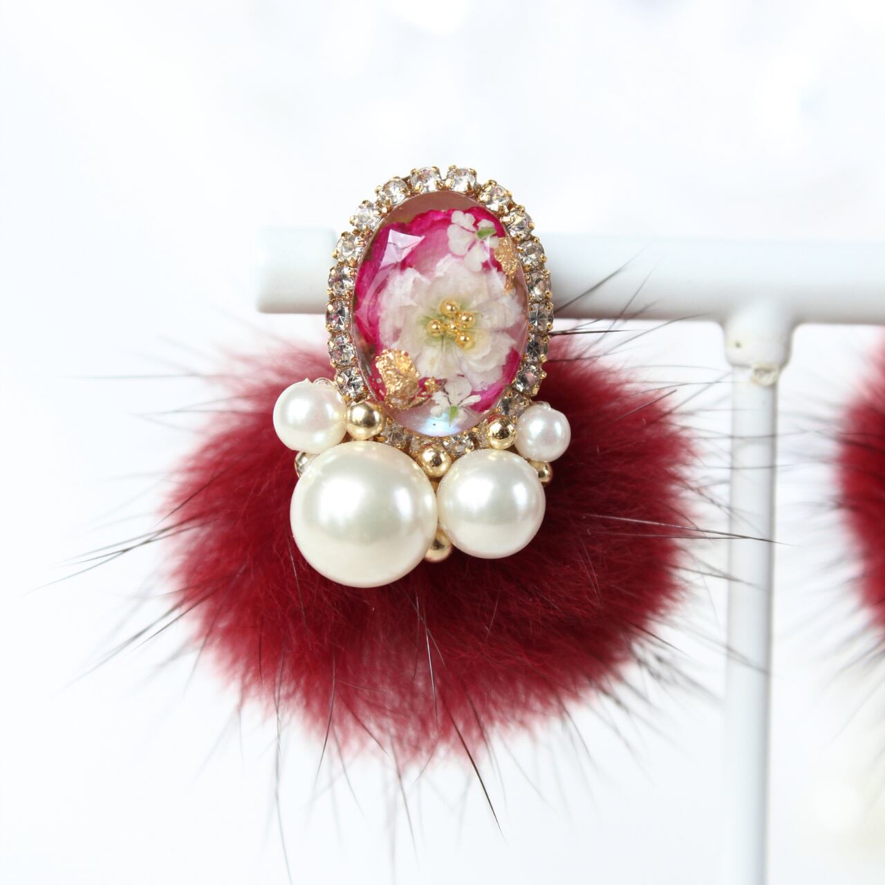 ボルドーカラーが印象的なミンクファーイヤリング